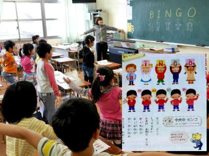 2年生が楽しそうに、大きな声で歌いながら「あそびうた」をうたっていました。「子犬のビンゴ」という歌で、「BINGO」のアルファベットにあわせてポーズします。みんな笑顔でとても楽しそうですね。