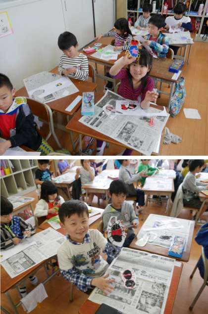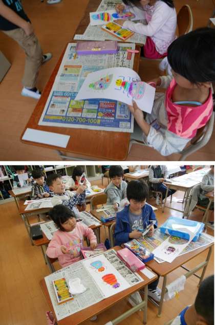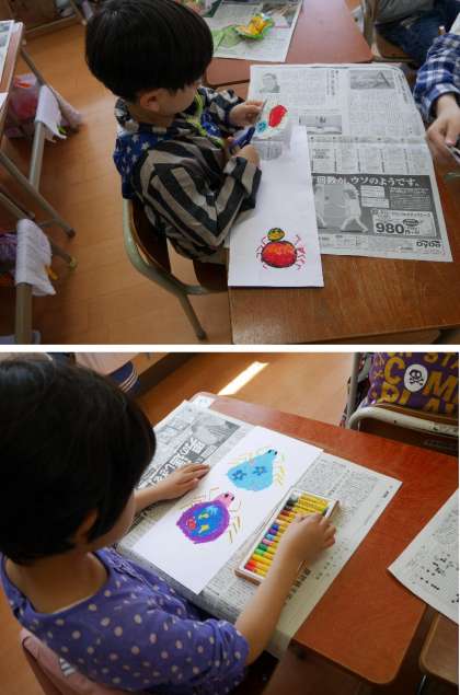 1年生が、クレパスですてきなくもを描いています。描いたクモをはさみできっていきます。足が細すぎて切るのがむずかしいね。