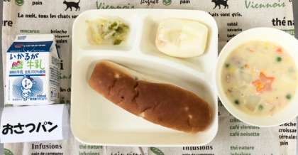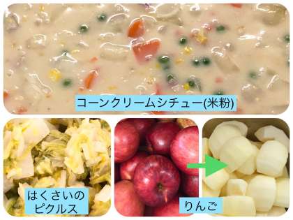 今日の献立は、コーンクリームシチュー[米粉]・はくさいのピクルス・りんご・おさつパン・牛乳でした。