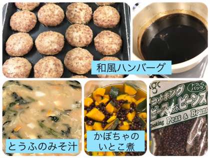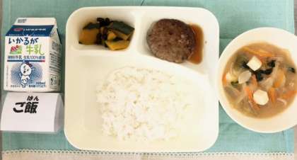 今日の献立は、和風ハンバーグ・とうふのみそ汁・かぼちゃのいとこ煮・ごはん・牛乳でした。