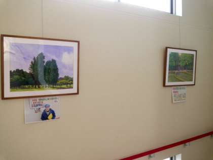焼野在住の方の水彩画をお借りして階段踊り場に展示しています。四季折々の鶴見緑地の絵です。とてもすてきな絵です。