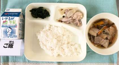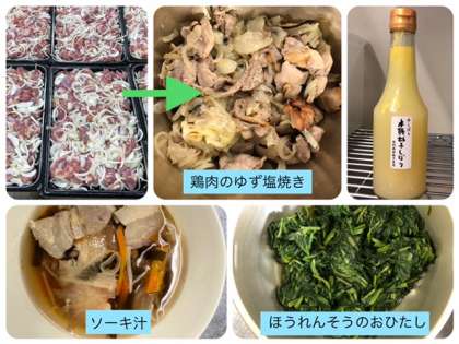 今日の献立は、鶏肉のゆず塩焼き・ソーキ汁・ほうれんそうのおひたし・ごはん・牛乳でした。