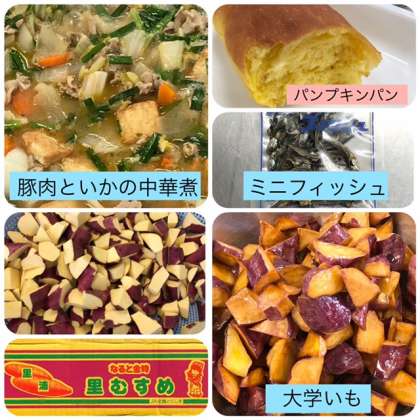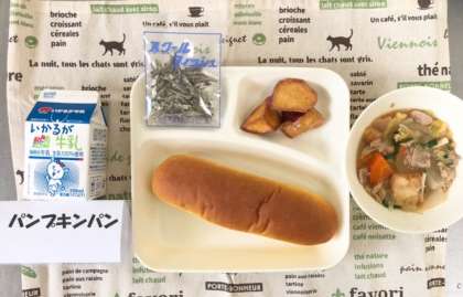 今日の献立は、豚肉といかの中華煮・大学いも・ミニフィッシュ・パンプキンパン・牛乳です。