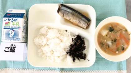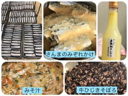 今日の献立は、さんまのみぞれかけ・みそ汁・牛ひじきそぼろ・ごはん・牛乳です。
