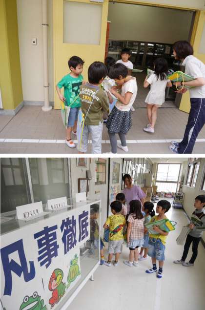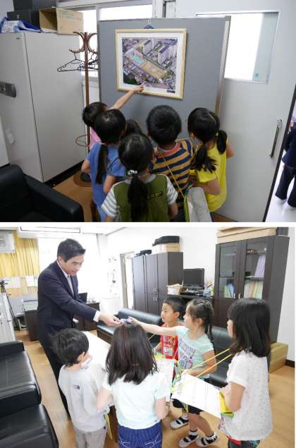 2年生が学校のいろいろな教室につれていってくれて案内してくれました。給食室、職員室、理科室、図書室、そして、校長室にもきてくれました。各教室にはカードがあって、それを1年生がもらって帰ります。校長室で、航空写真を熱心に見ているチームもありました。校長先生からカードを直接おわたししました。