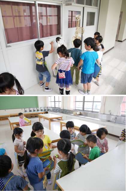 2年生が1年生の教室まで迎えに来てくれました。さあ、学校探検に出発です。理科室には、人体模型とがいこつさんがお出迎えしてくれています。プールも4階から見えたね。図工室や管理作業員室にもいきました。