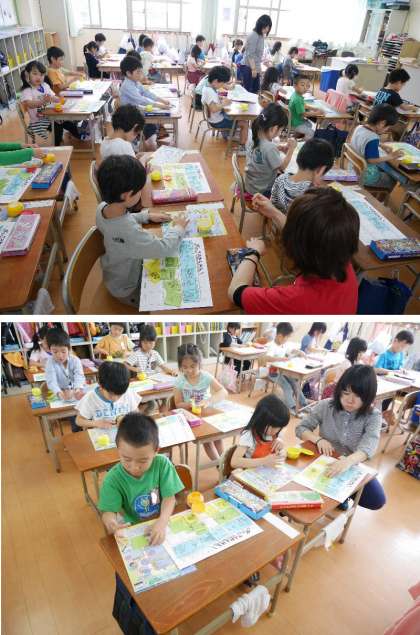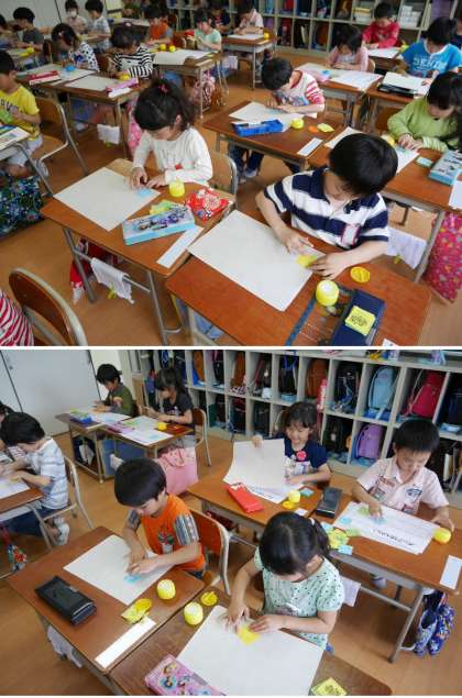 校内探検でたくさんのカードがあつまりました。そのカードを用紙にはって、どんなところだったか発表したりしました。カードをみずのりで貼り付けます。初めてのりをつかうので、先生からていねいにはり方をおしえてもらって、指でうすくのばしてはっていました。
