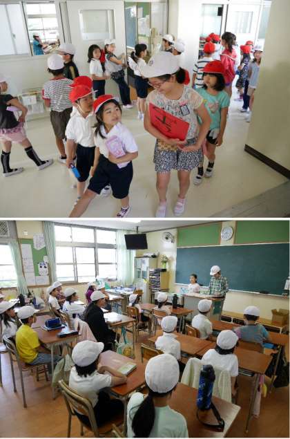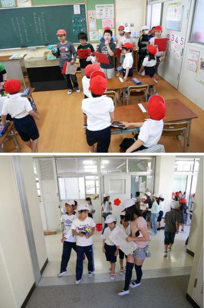今日は、今年のたてわり班の初顔あわせです。6年生が1年生を教室まで迎えに来ました。1年生は初めてのたてわり班ですね。6年生のおにいさんとおねえさんが、やさしく連れて行ってくれます。
