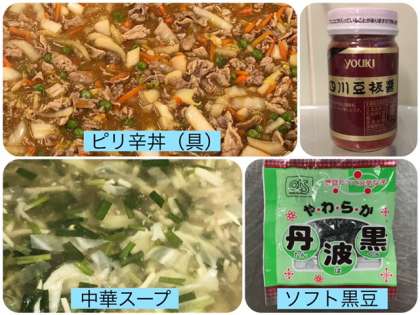 今日の献立は、ピリ辛丼・中華スープ・ソフト黒豆・牛乳でした。