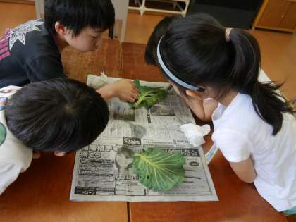 3年生が学習園のキャベツからとつたたまごがかえり、さなぎになりました。もうすぐちょうちょになりますね。楽しみです。