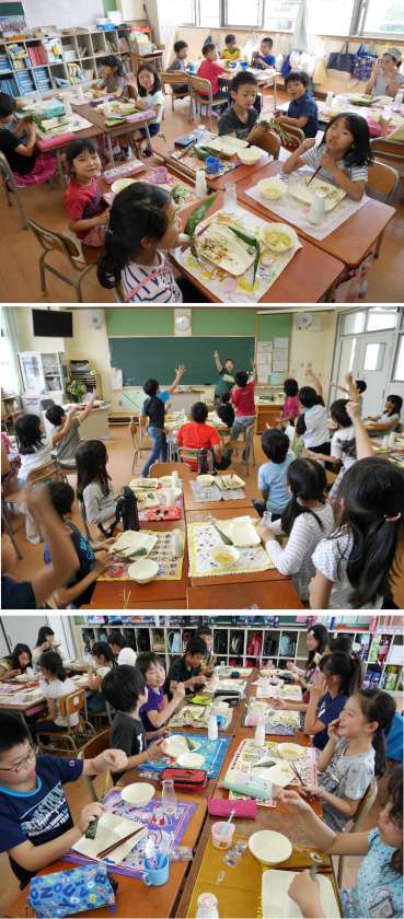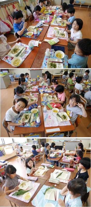 今日の給食は、「こどもの日」の特別こんだてです。「牛肉のちらしずし」「五目汁」「ちまき」です。1年生の子どもたちは「ちまき」をみて、「これ何?」と初めて食べる子どももいるようです。あまくておいしいおもちがおいしかったですね。