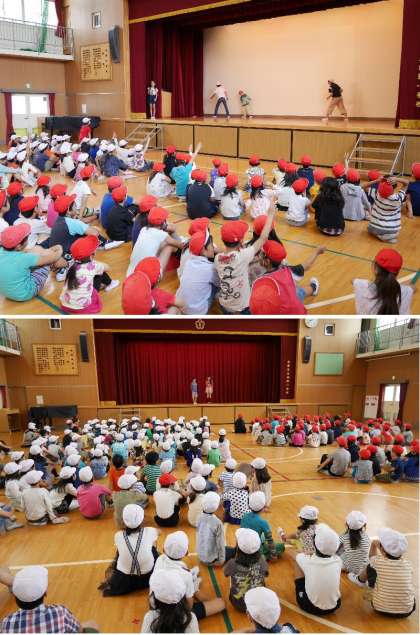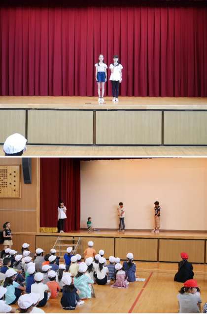毎週木曜日は児童集会です。集会委員会担当の高学年が、毎回工夫をこらしたゲームやクイズを用意してくれて、みんなを楽しませてくれます。今日はジェスチャーのまちがいさがしです。二つの場面で違うところはどこかな。