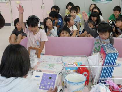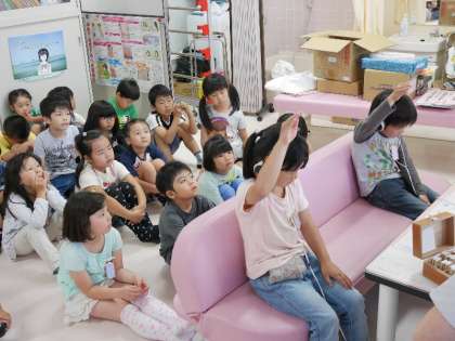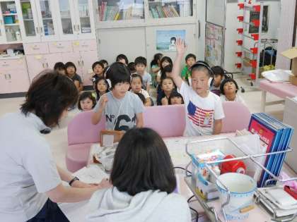 今日は2年生の聴覚検査を保健の先生がしてくれました。ヘッドフォンから高い音や低い音が聞こえると手をあげます。ほかのみんなも静かにまっています。