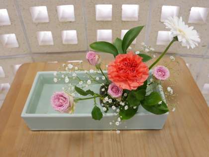 いつも、地域の方に活けていただいている玄関のお花があります。今月はバラですね。とてもあざやかにきれいですね。