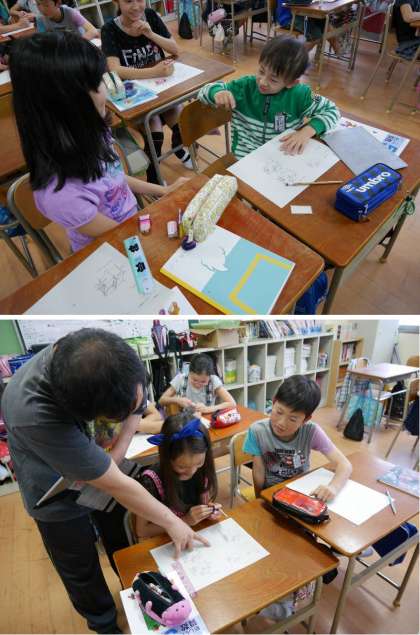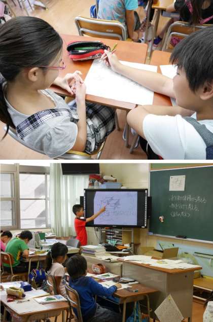 エル字型の直方体の体積の計算をしています。近くの友だちと意見を交換しあって考えています。自分の考え方を電子黒板に写しだして説明をしていますね。みんなわかったかな。