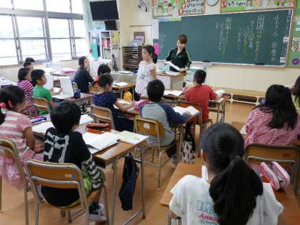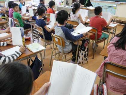 6年では国語の学習をみんなで教科書を読んで考えています。根拠をもって学習にがんばっています。