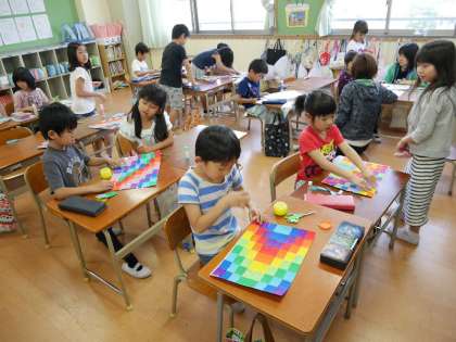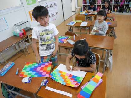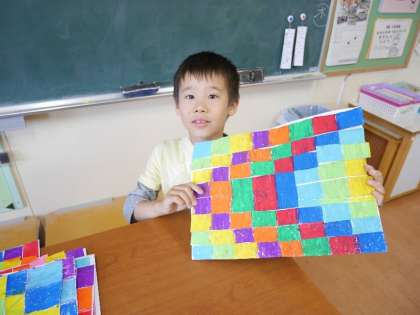 2年生が色をクレパスでぬって、それを切ってずらして並べて貼ると、とてもきれいな作品ができあがりました。
