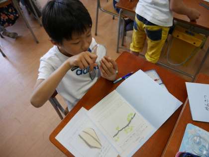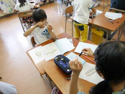 4年生の理科では、観察をしたことを記録しています。イチョウの葉やひょうたんのタネを虫メガネで観察して記録しています。