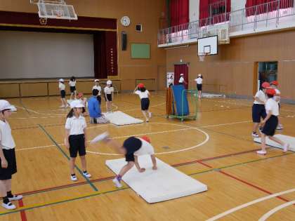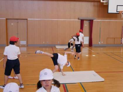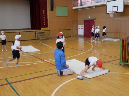 4年体育はマット運動です。開脚前転や側転などの練習をしています。なかなかきれいに演技するのはむずかしいね。