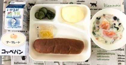 今日の献立は、きのこのクリームシチュー・きゅうりのバジル風味サラダ・りんご・コッペパン・マーマレード・牛乳でした。