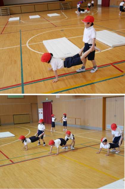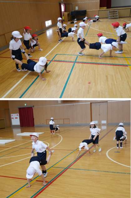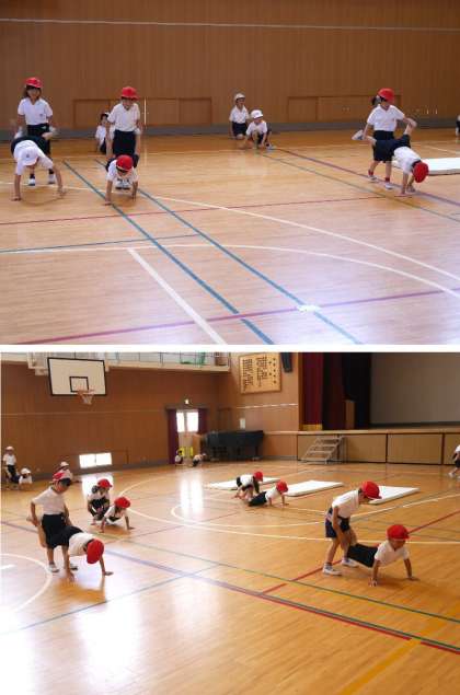 1年生が体育館で体育をしています。ペアになって足をもってもらい、手だけで前進します。がんばっています。