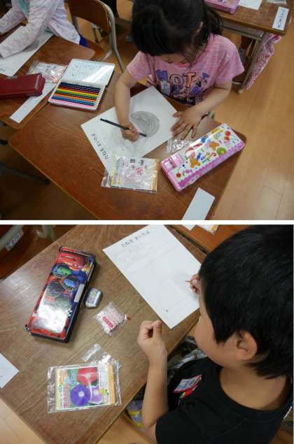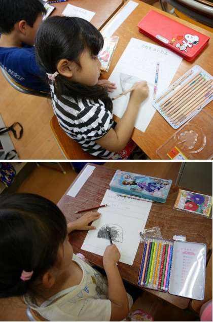 1年生では、あさがおを育てて観察して学習していきます。そのあさがおのタネを植える前に観察していました。よく見てみると真っ黒ではないんですね。