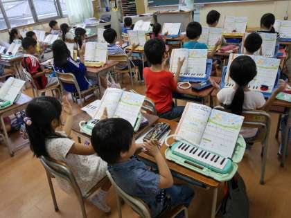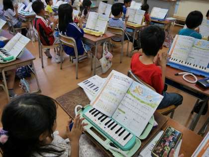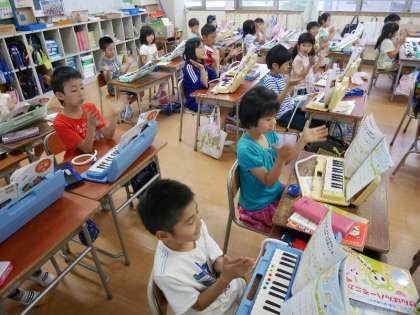 2年生の音楽です。曲にあわせて2拍子のリズムをとっています。じょうずにリズムがとれるかな。