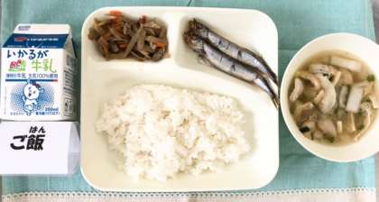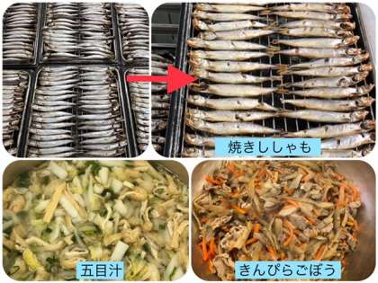今日の献立は、焼きししゃも・五目汁・きんぴらごぼう・ごはん・牛乳でした。