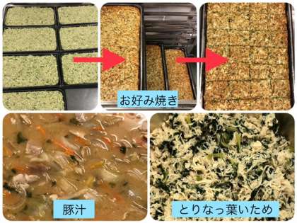 お好み焼きは、鶏卵、水、やまいもとろろ、小麦粉、塩で作った生地に、かつおぶし、あおのりを混ぜ、キャベツ、青ねぎを加えて焼き、ホテルパンの上で切り分けて配缶します。これに、小袋のトンカツソースがつきます。今日のキャベツは愛知県産のものです。