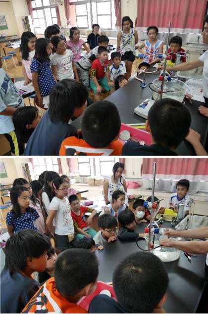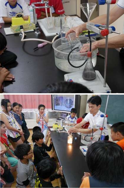 理科の授業はいつも実験がとても楽しいですね。子どもたちの目もくぎづけです。炭をもやしたり、過酸化水素水から酸素を作って、鉄のウールを燃やしたりする実験です。酸素中での燃え方などしっかり観察できました。
