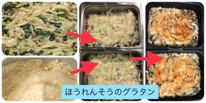 グラタンは、冷凍のほうれんそう、たまねぎ、ベーコンに、ホワイトソースとよく絡むエルボ型のマカロニを使用しています 。1クラスごとにミニバットに入れ、その上に粉末チーズとパン粉を混ぜ合わせたものを振り、焼き物機で焼き色を付けています。