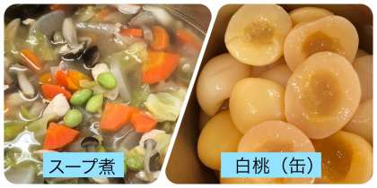 今日の献立は、スープ煮・ほうれんそうのグラタン・白桃(缶)・黒糖パン・牛乳でした。