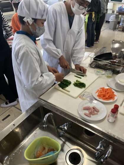 6年生になって初めての調理実習で、「いろどりいため」を作りました。野菜やハムを切って炒め、美味しくいただきました。手際よく洗い物もこなし、最後までグループで協力して楽しく活動することができました。