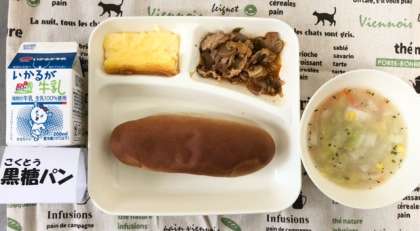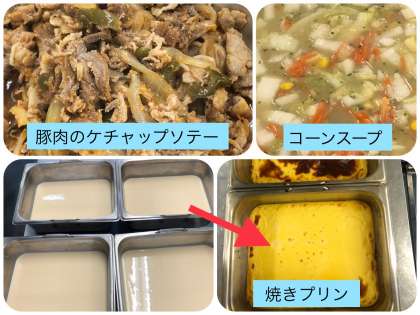 今日の献立は豚肉のケチャップソテー・コーンスープ・焼きプリン・黒糖パン・牛乳でした。