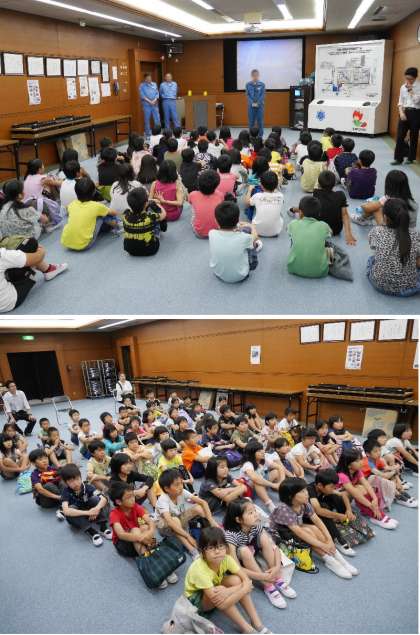 4年生が社会科の学習として、環境事業局の焼却工場に見学にいきました。歩いて10分ほどで着きます。たくさんの職員の方が出迎えていただきました。ビデオをみて学習したあとに、工場内の見学をしました。