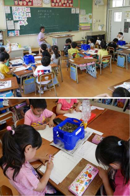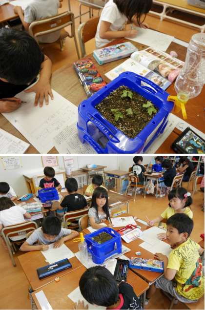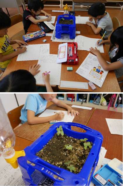 1年生が植えたアサガオのタネから双葉がでてきました。生長が早いですね。教室で「みつけたよ」のカードに今日のできごとを書いています。