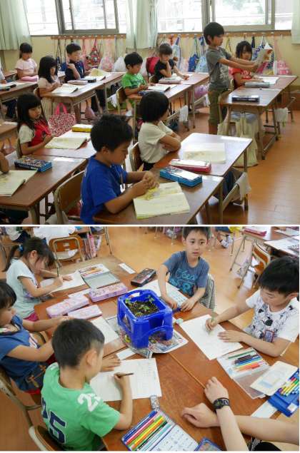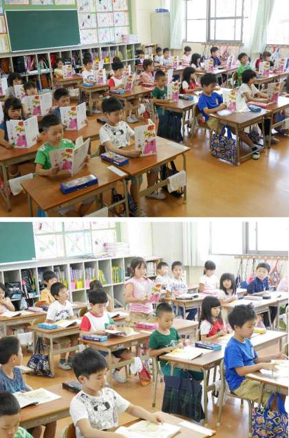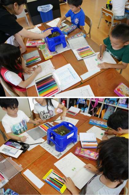 1年生の国語で、みんなで音読しています。読んでいるのは「とん こと とん」です。しっかりと教科書をもって大きな声で読みます。アサガオの芽の観察もしていますね。