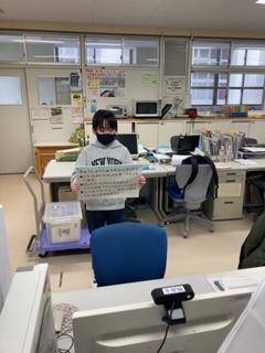 最後に給食委員会代表の児童が、給食調理員さんに日ごろの感謝を伝え、全校児童で作った「給食カレンダー」をプレゼントしました!