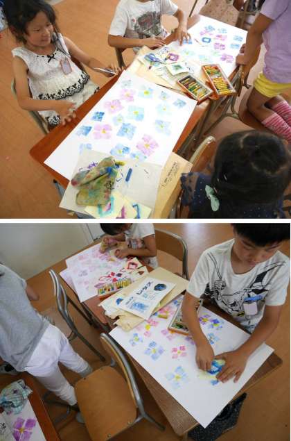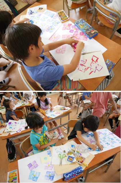 かたがみを使って、いろいろな色をスタンプして花をアートしています。重ねていくととてもきれいな絵になりますね。
