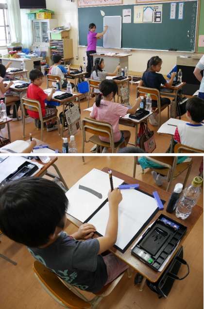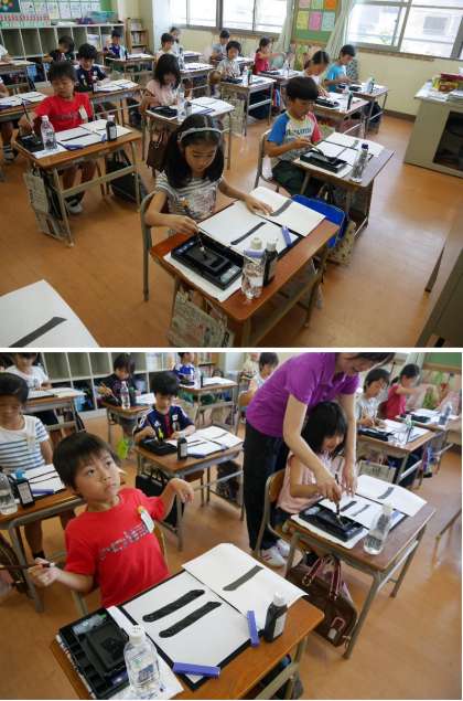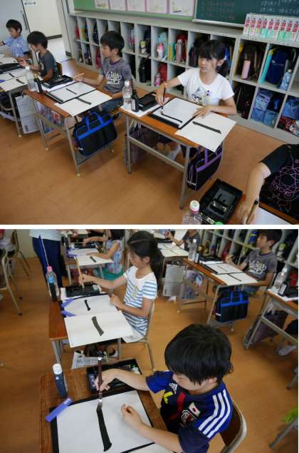 3年生から習字の授業が始まります。筆の持ち方や姿勢を学習して、筆をしっかりと立てて、「一」を書いています。筆を入れる最初と終わりがむずかしいね。