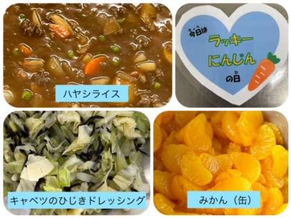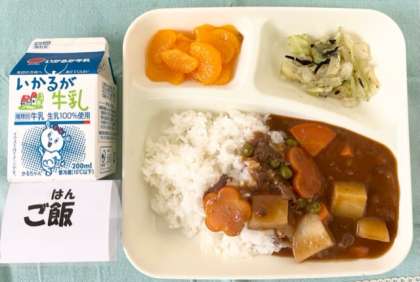 今日の献立は、ハヤシライス・キャベツのひじきドレッシング・みかん(缶)・牛乳でした。