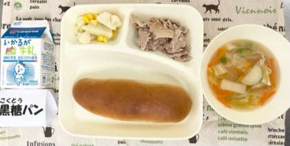 今日の献立は、豚肉のガーリック焼き・スープ・カリフラワーとコーンのサラダ・黒糖パン・牛乳でした。