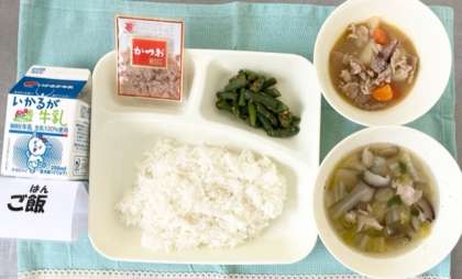 今日の献立は、変わり肉じゃが・鶏肉と白菜のすまし汁・さんどまめのごまあえ・ごはん・牛乳でした。この献立は、令和2年度学校給食献立コンクール最優秀賞作品をもとにした献立です。