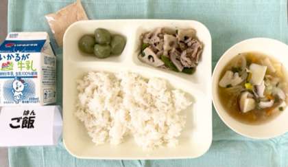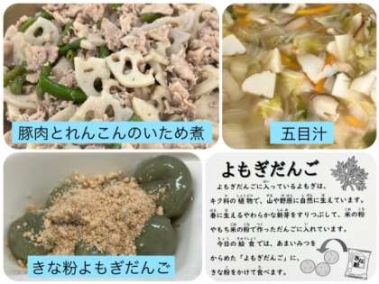 今日の献立は、豚肉とれんこんのいため煮・五目汁・きな粉よもぎだんご・ごはん・牛乳でした。