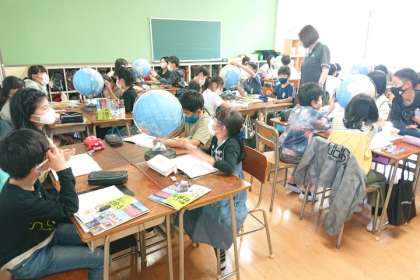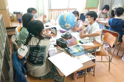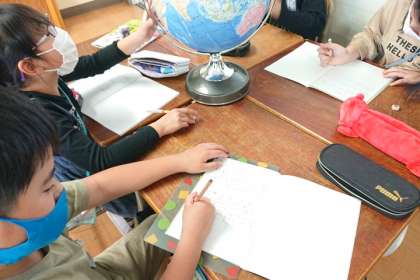 社会科の学習では、グループで地球儀を見ながら、気付いたことをノートにメモしています。