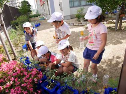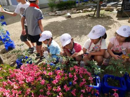 毎朝、2年生の子どもたちは自分のミニトマトに水をあげています。とてもちいさなまだ緑色のミニトマトを見つけました。