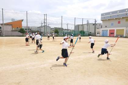 4人が1グループになって竹馬を1本ずつもち、一斉に手をはなして、隣の友達の竹馬をすばやくつかみにいきます。
