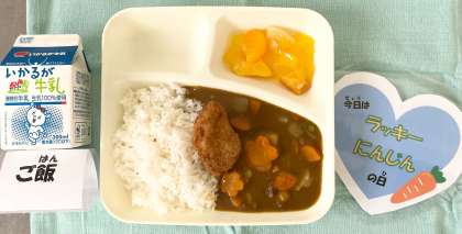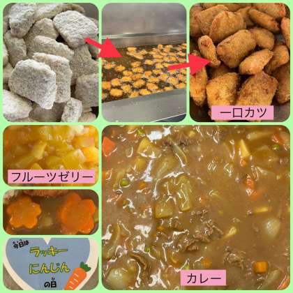児童に毎回好評な「カツカレーライス」です。冷凍のまま菜種油で揚げた一口トンカツを、牛肉を主材としたカレーライスに添えます。給食室では、カレーに入れるラッキーにんじんをたくさん作っていただきました。