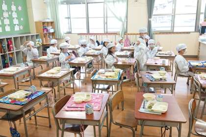 給食当番が、おかずやごはん、牛乳などを運んできました。
