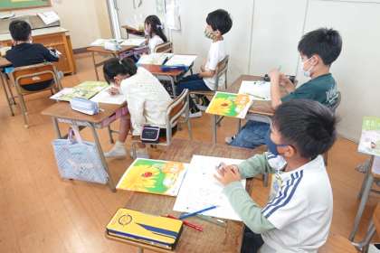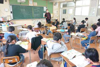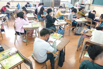 今日は、草花や昆虫などの観察の仕方や、観察カードの書き方について学習しています。